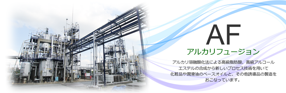 アルカリ溶融酸化法による高級脂肪酸、高級アルコール、エステルの合成から、新しいプロセス技術を用いて、化粧品や潤滑油のベースオイルと、その他誘導品の製造をおこなっています。ファインケミカル